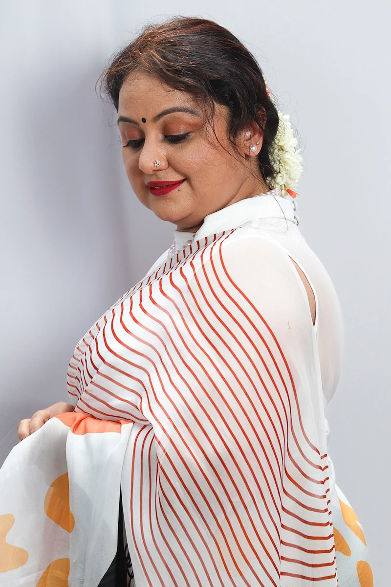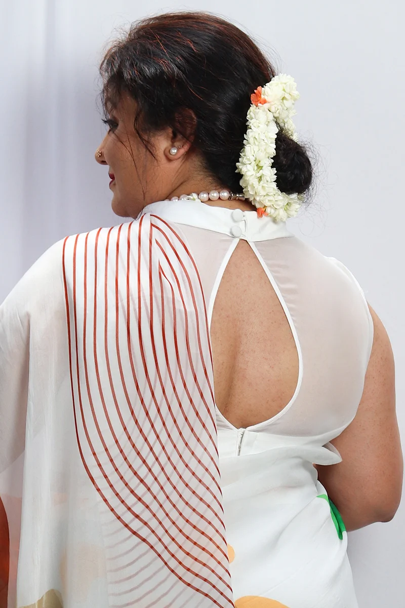 This blouse is a vision of understated elegance and modern tradition, crafted in soft organza. The back design includes a graceful keyhole opening secured with fabric-covered buttons at the neck, adding a refined and feminine detail.