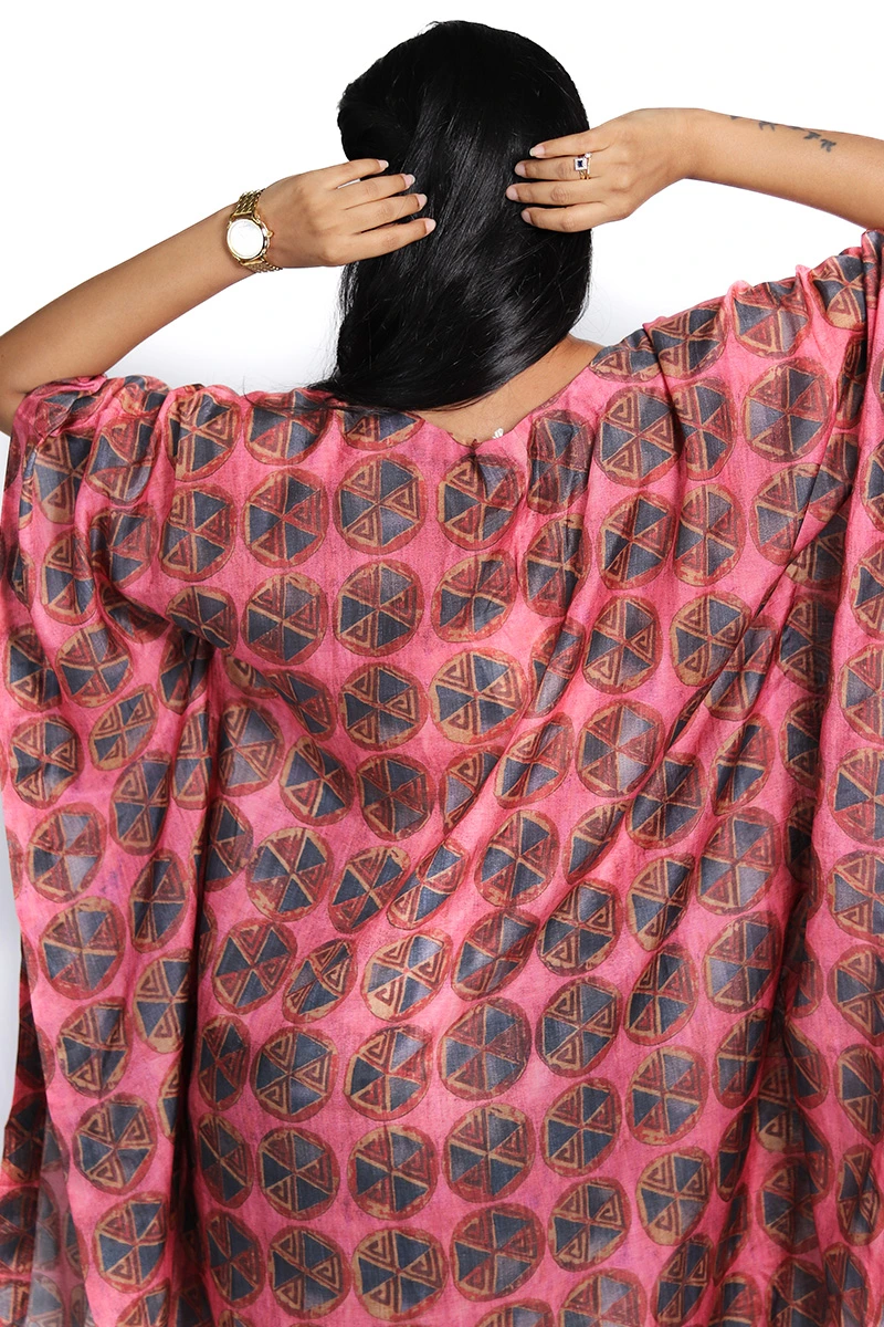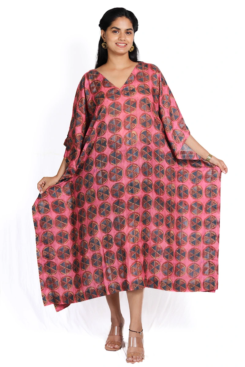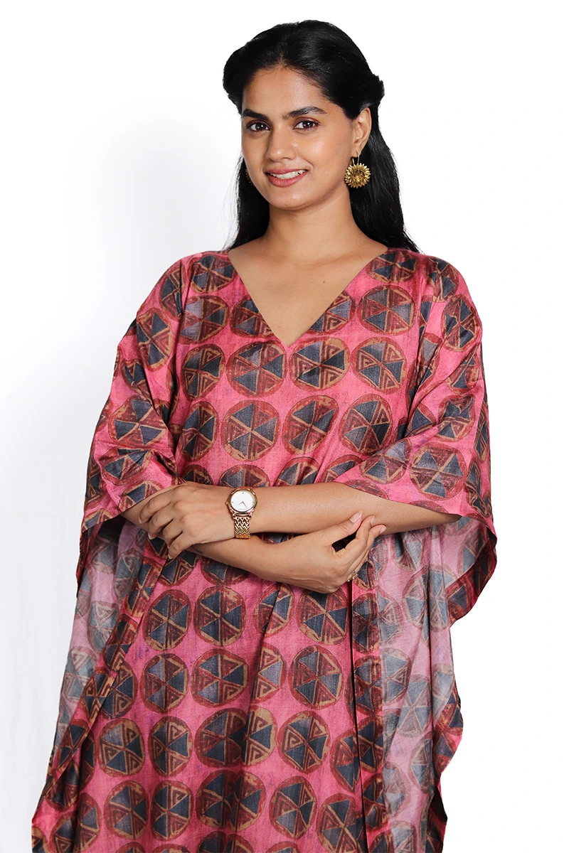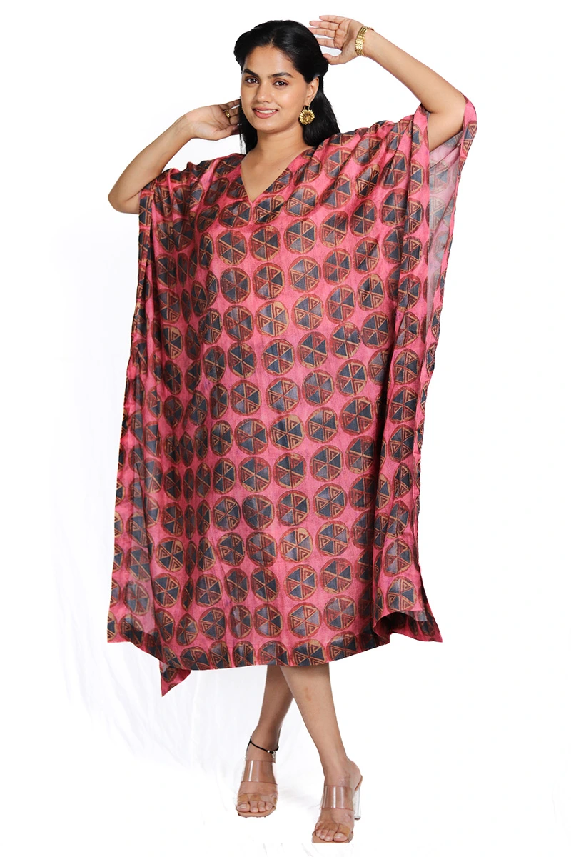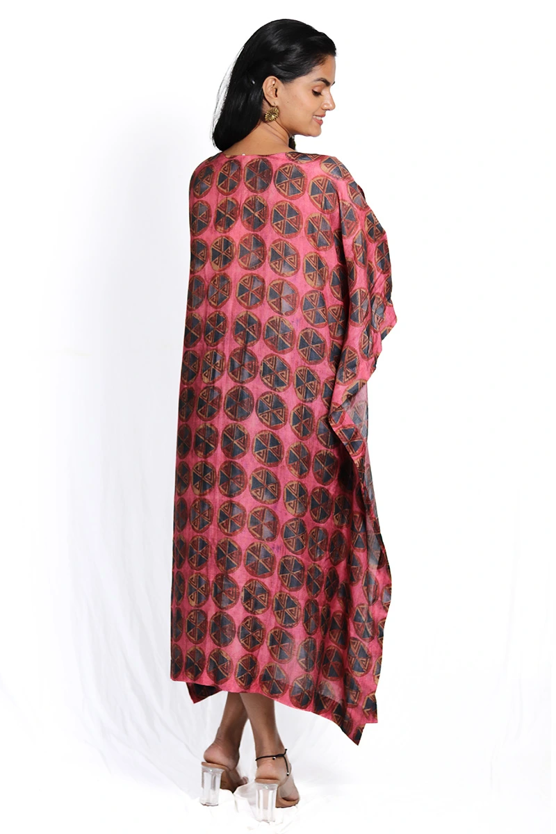 This striking kaftan features a rich crimson base adorned with an all over geometric pattern in contrasting hues, creating a bold yet sophisticated look. The free flowing silhouette, wide sleeves, and V-neckline offer effortless comfort and ease of movement. Crafted from lightweight fabric, it drapes gracefully.