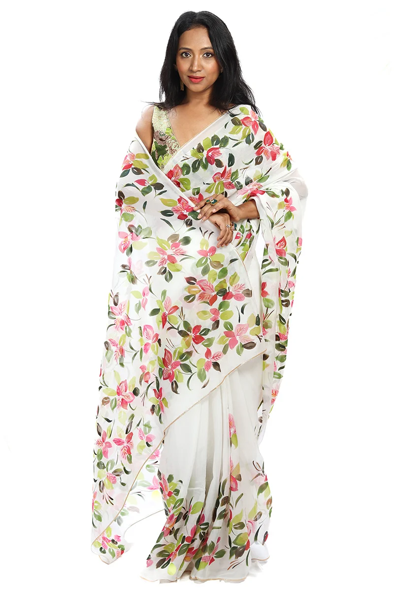 This blouse features a bold and artistic floral design set against a deep, dark green base, creating a rich and elegant contrast. The sleeveless silhouette and deep V-neckline give it a modern and flattering appeal, Embellished with shimmering thread-work & is crafted in soft organza.