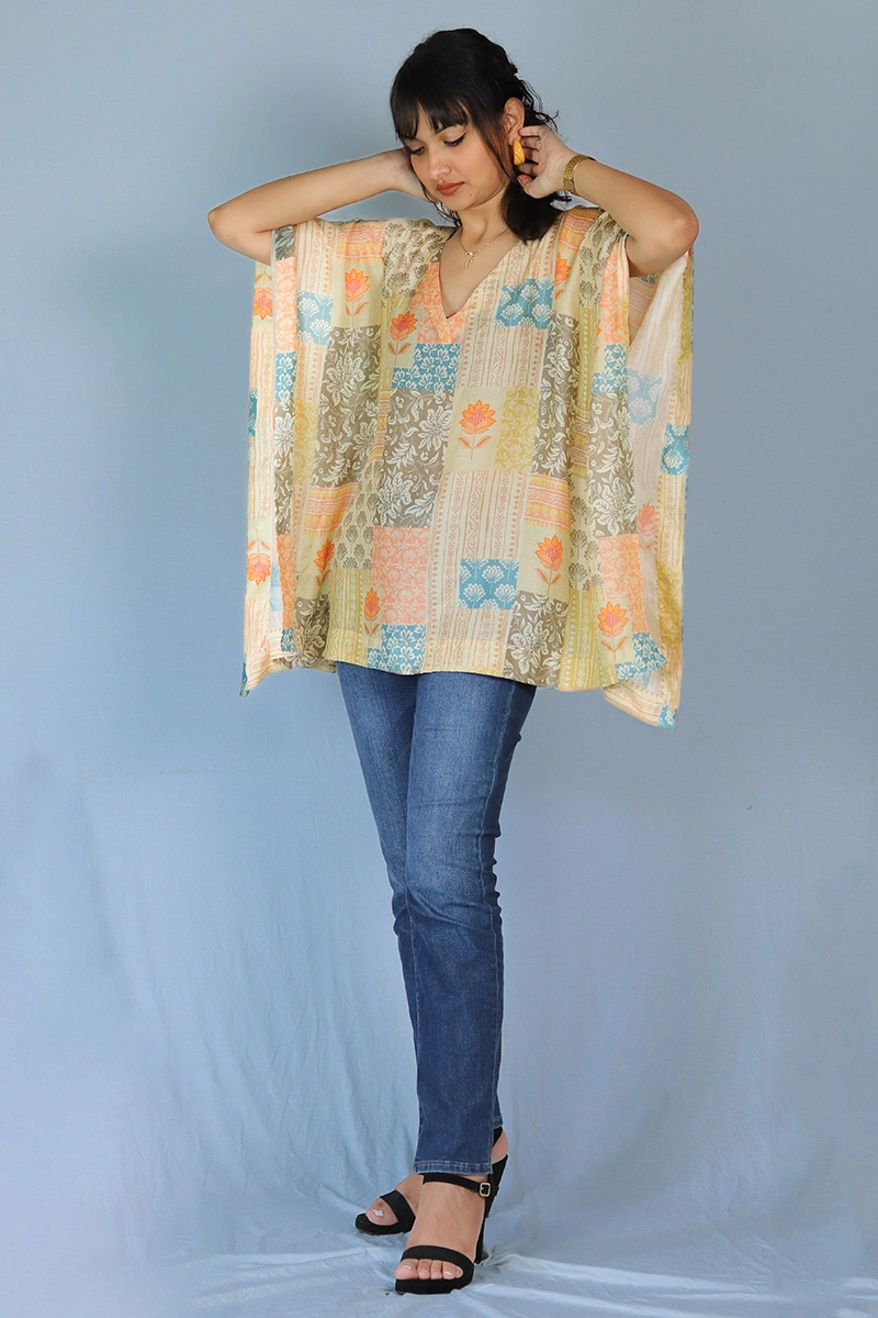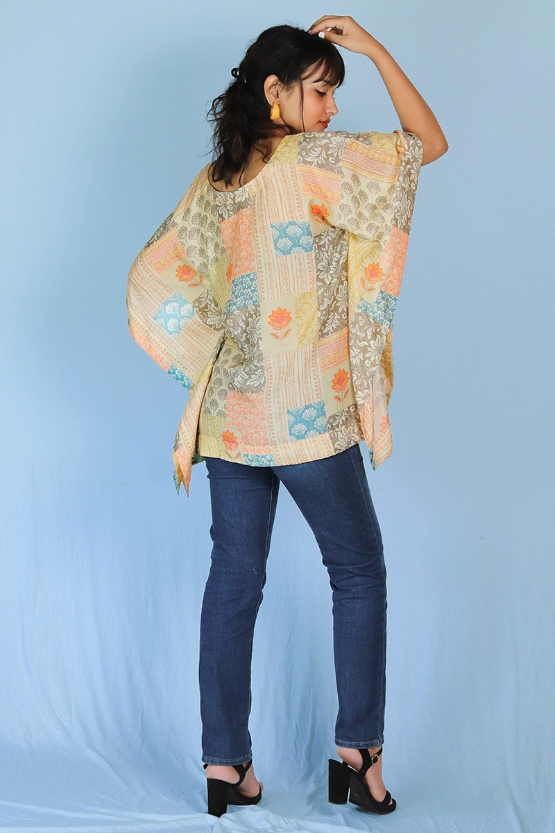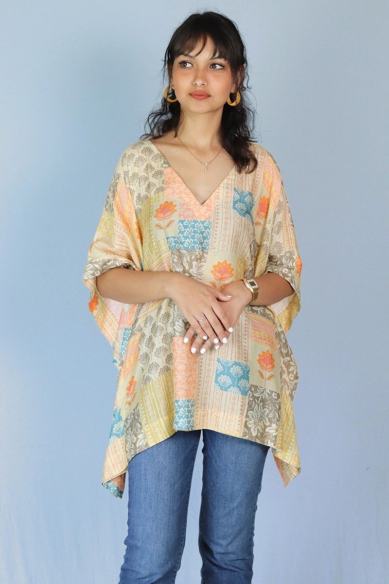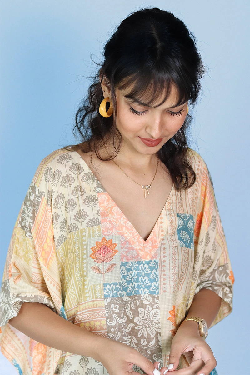 Celebrate timeless craftsmanship with this patchwork-inspired kaftan, a vibrant blend of tradition and modern comfort. Crafted from viscose fabric.The patchwork effect adds a rich, artisanal charm, while the relaxed silhouette and V-neckline offer effortless style.