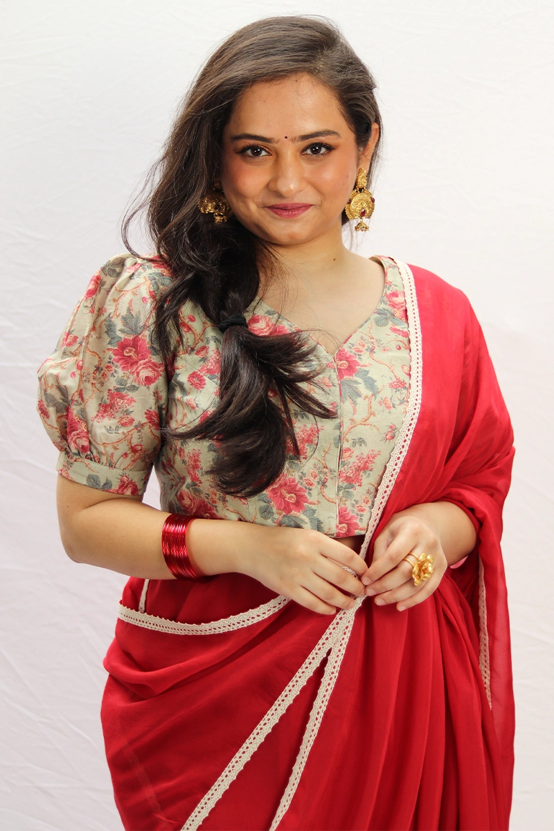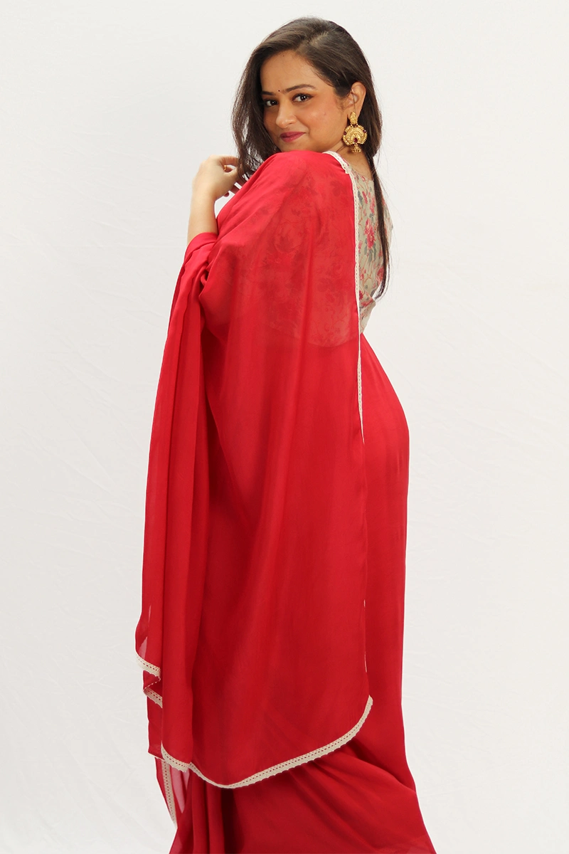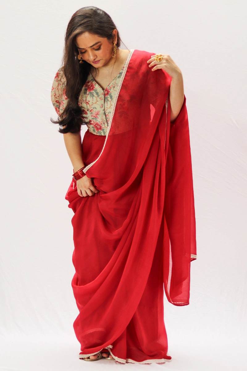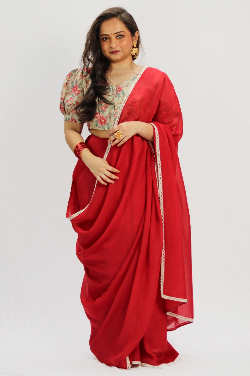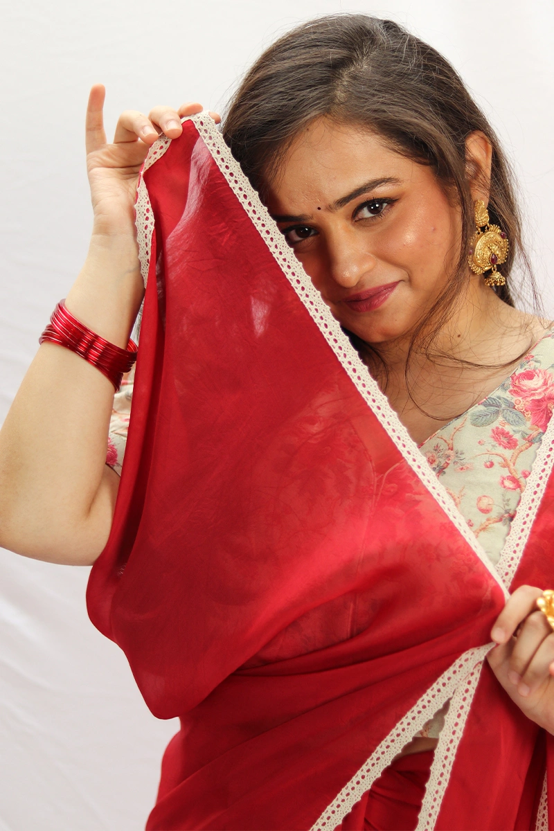 A vibrant rose red saree is crafted in light weight organza. The saree is bordered with a delicate crochet lace, adding subtle elegance.