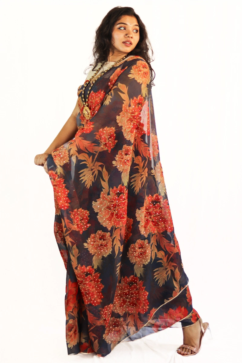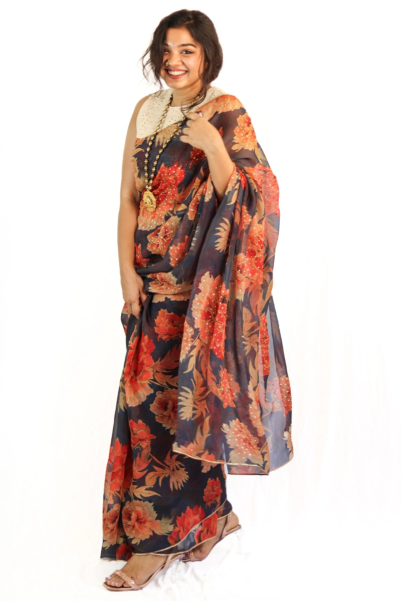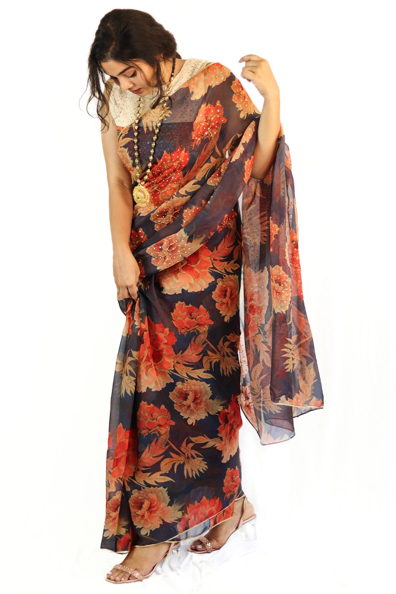 This saree has been crafted in organza and hand embroidered with sequence and crochet lace.