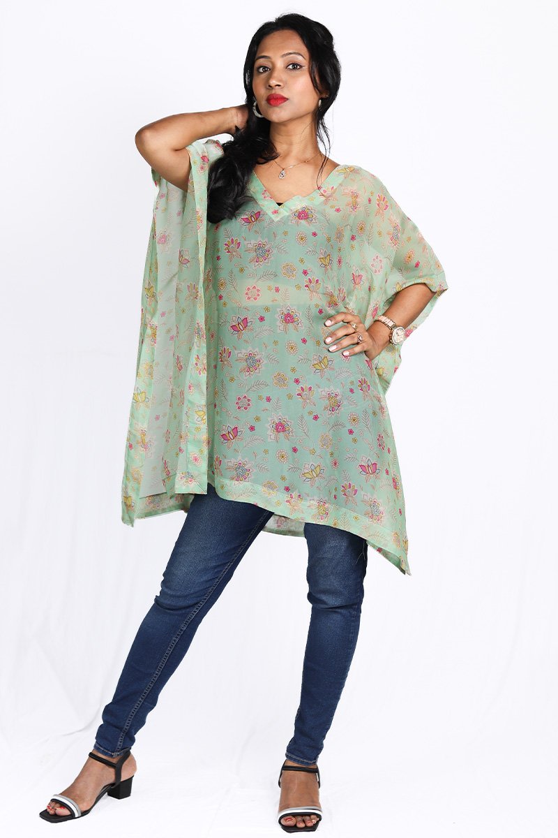 Fresh, flowy, and effortlessly feminine this mint green kaftan is a charming blend of comfort and style. Adorned with soft floral prints & crafted in lightweight organza.