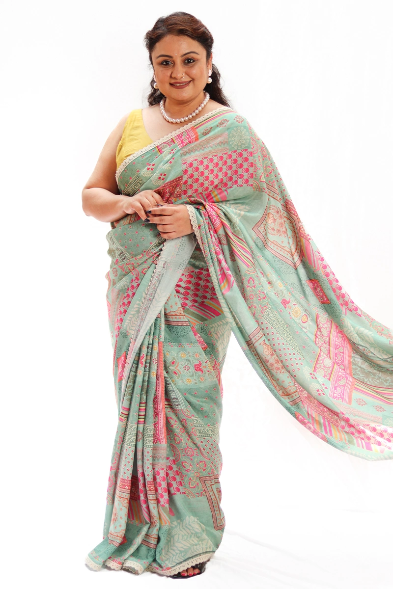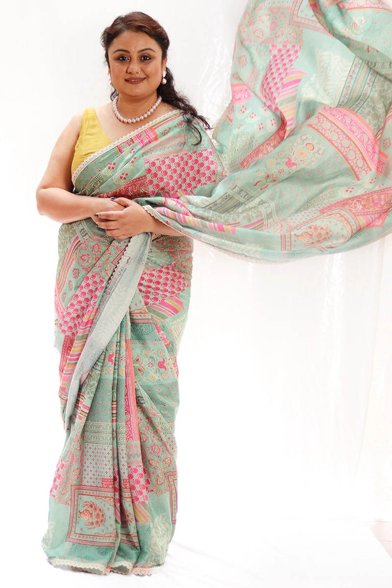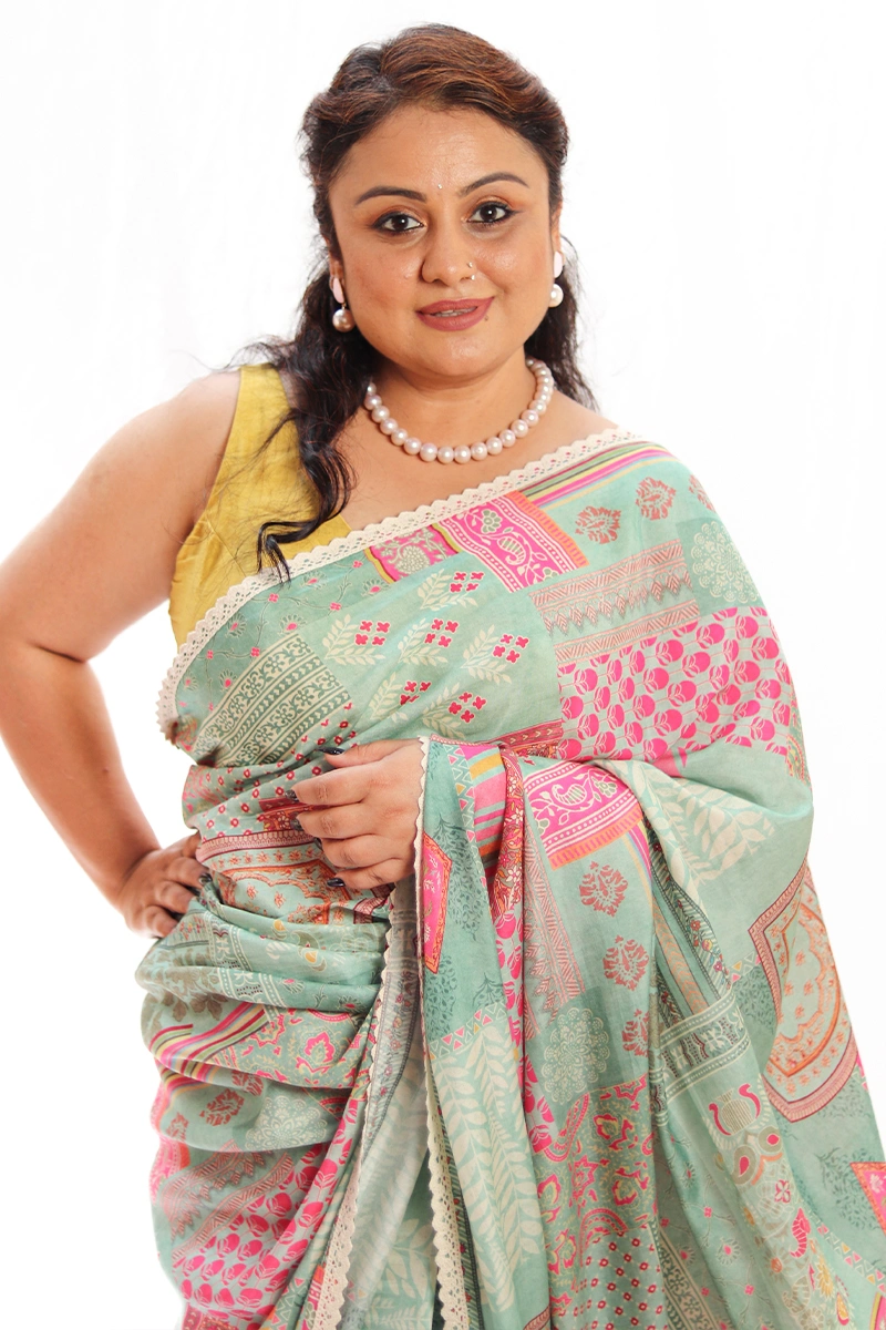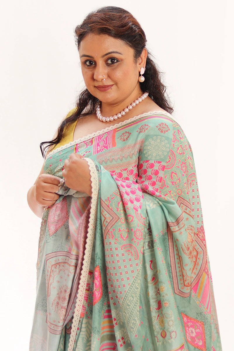Step into timeless elegance with this graceful blend of of tradition & modernity, crafted in soft & breathable viscose fabric, adorned with vibrant digital prints, the intricate patterns is a mix of floral motifs, paisleys & geometric designs.The saree is finished with a delicate crochet lace.