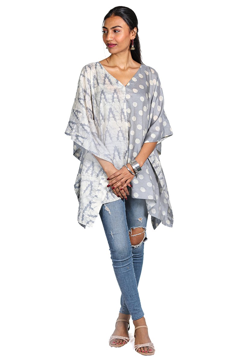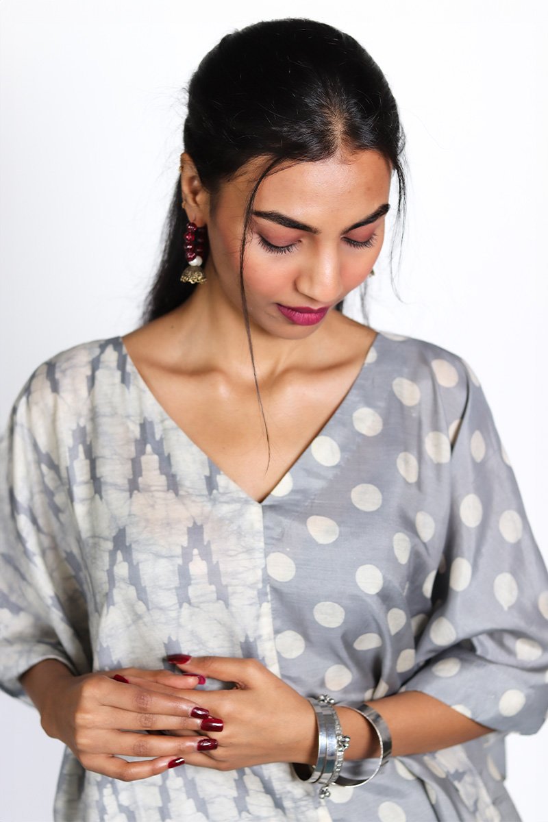 Contemporary and carefree, this grey dual-print kaftan is a fresh take on everyday dressing. Featuring a unique half-and-half design, one side showcases a soft tie-dye pattern while the other is dotted with classic polka prints.The flowy silhouette and V-neckline add a relaxed, flattering touch