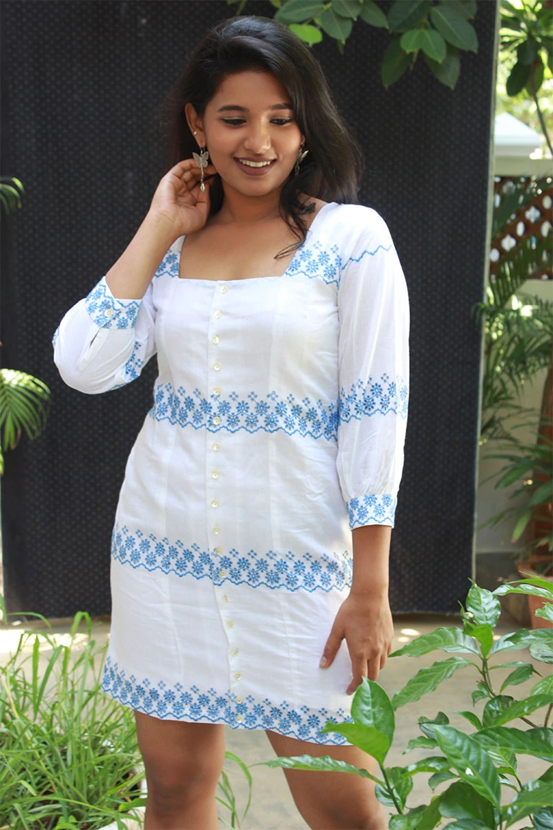 A graceful and elegant navy blue maxi dress, adorned with floral motifs that add a subtle touch of opulence. Crafted in a flowy, lightweight cotton Slub fabric, the dress features a structured bodice with broad shoulder straps, offering a flattering silhouette & a huge bow on the back.