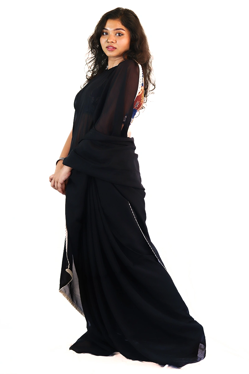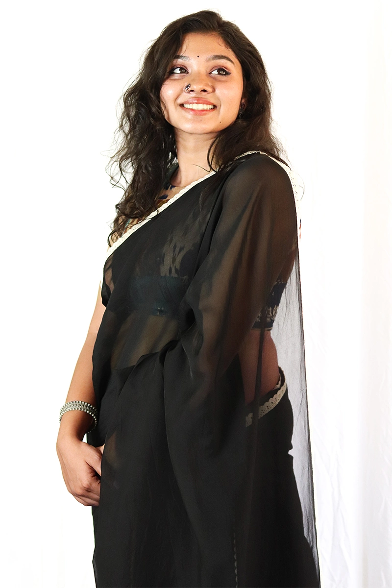 This saree is a stunning & sophisticated black ensemble crafted in lightweight organza which flows gracefully & creates a soft, ethereal effect. The saree is finished with a delicate off white crochet lace adding just the right amount of contrast.