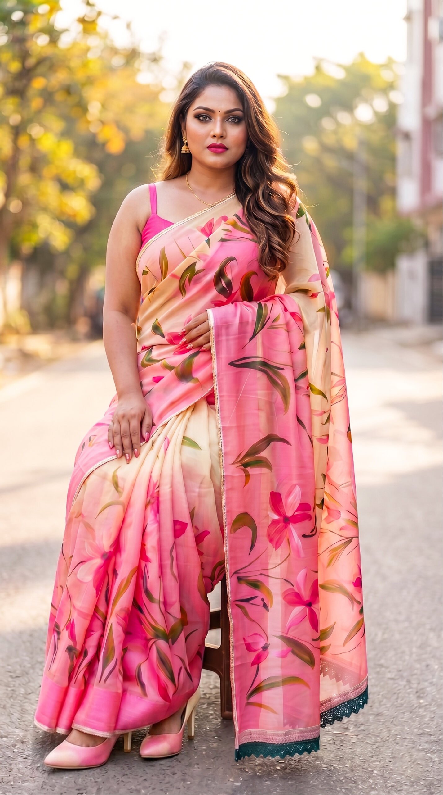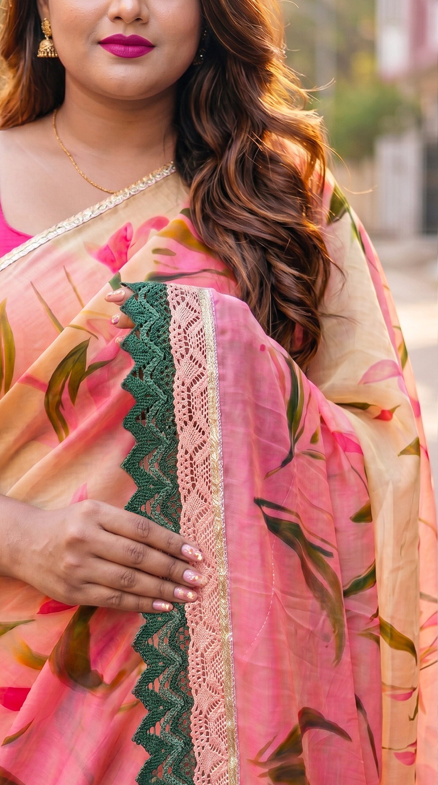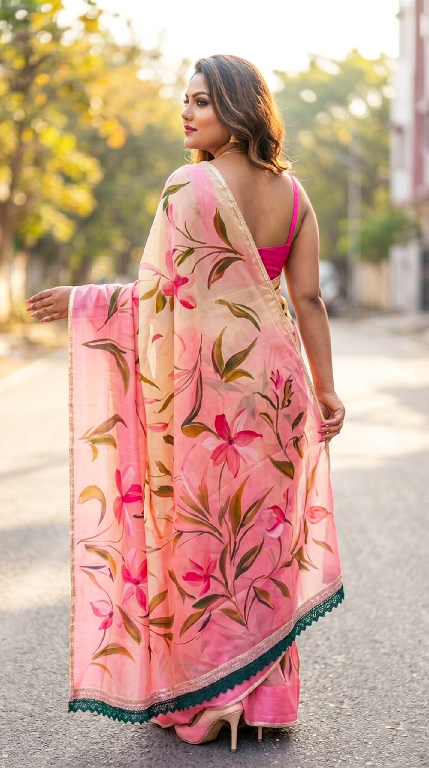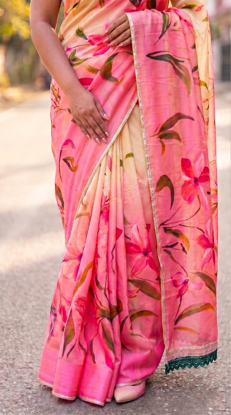 Crafted in airy cellulose organza, this exquisite saree features hand-painted florals in vivid tones, beautifully complemented by a fine gota and crochet border—bringing together elegance and festive allure.