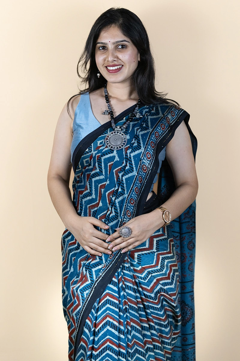 This is a refined & contemporary sleevless blouse in sleevless blouse in a soothing sky blue shade, tailored with chanderi silk fabric which is dyed using natural dyes.The blouse features a V neckline.