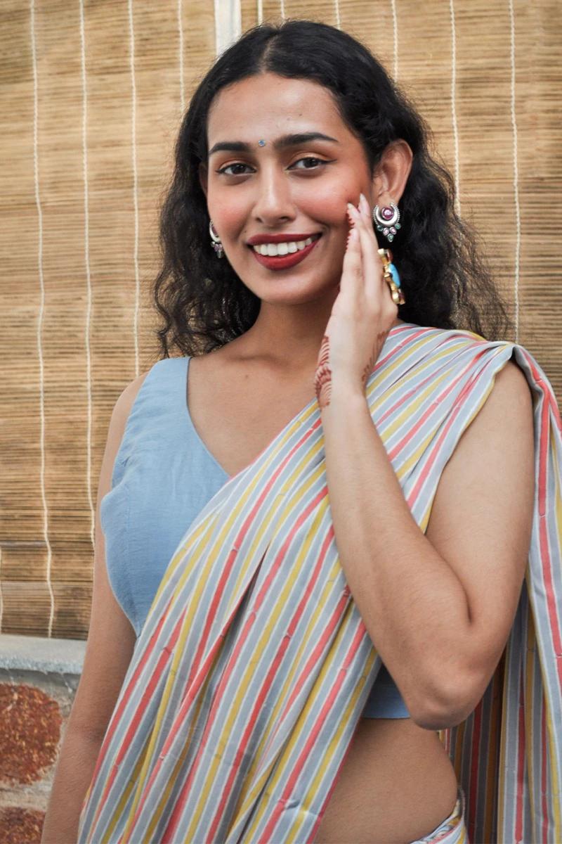 A charming fusion of modern minimalism and floral flair, this saree blends candy-hued stripes with a delicate floral print. Crafted in satin silk fabric & finished with crochet lace.
