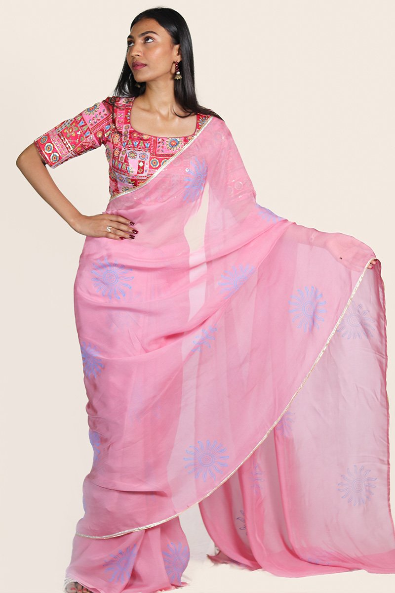 This saree is a vibrant yet graceful, crafted in lightweight organza, the saree falls beautifully creating a soft, flowing silhouette.Big floral block prints are spaced evenly across the saree creating a bold yet balance look & is finished with a gota border.