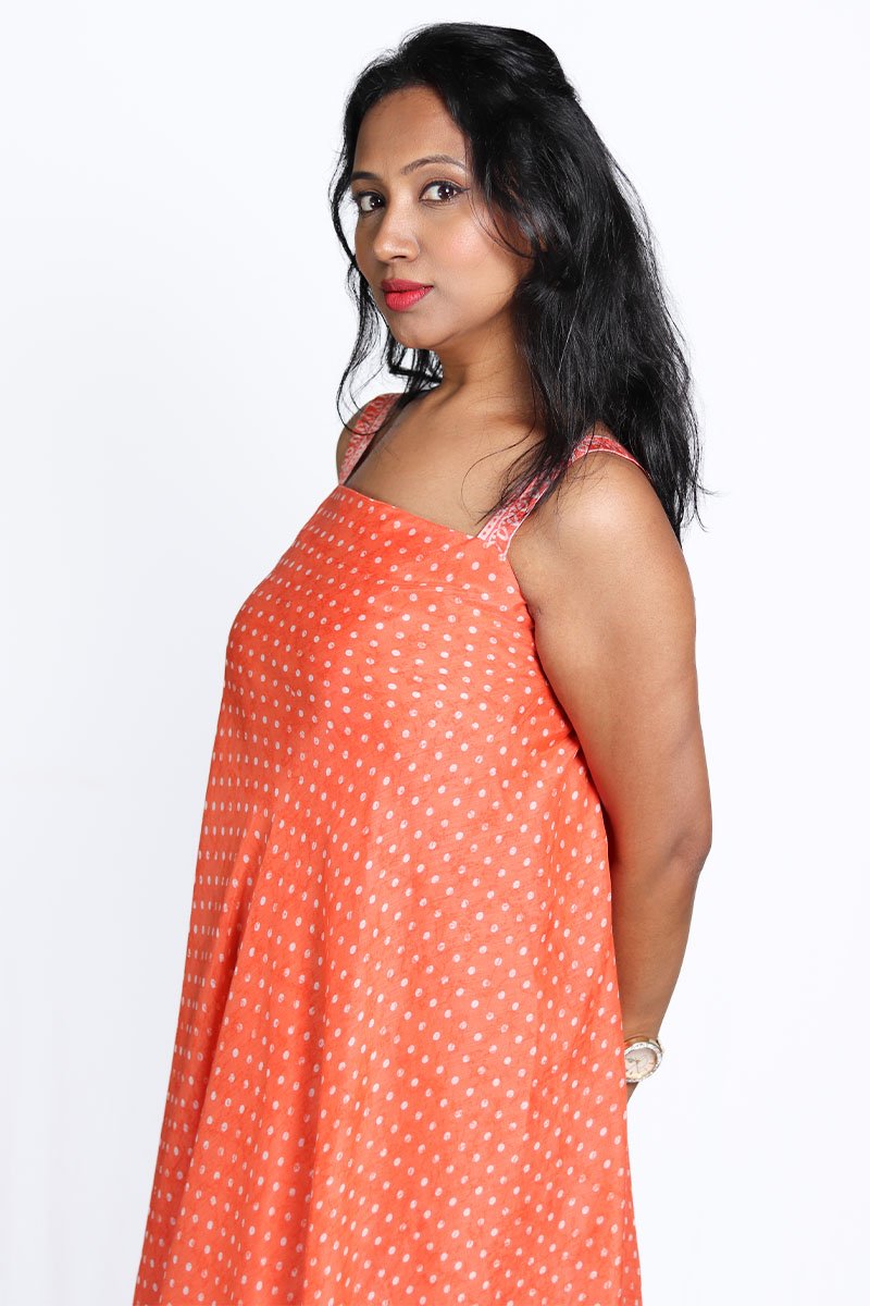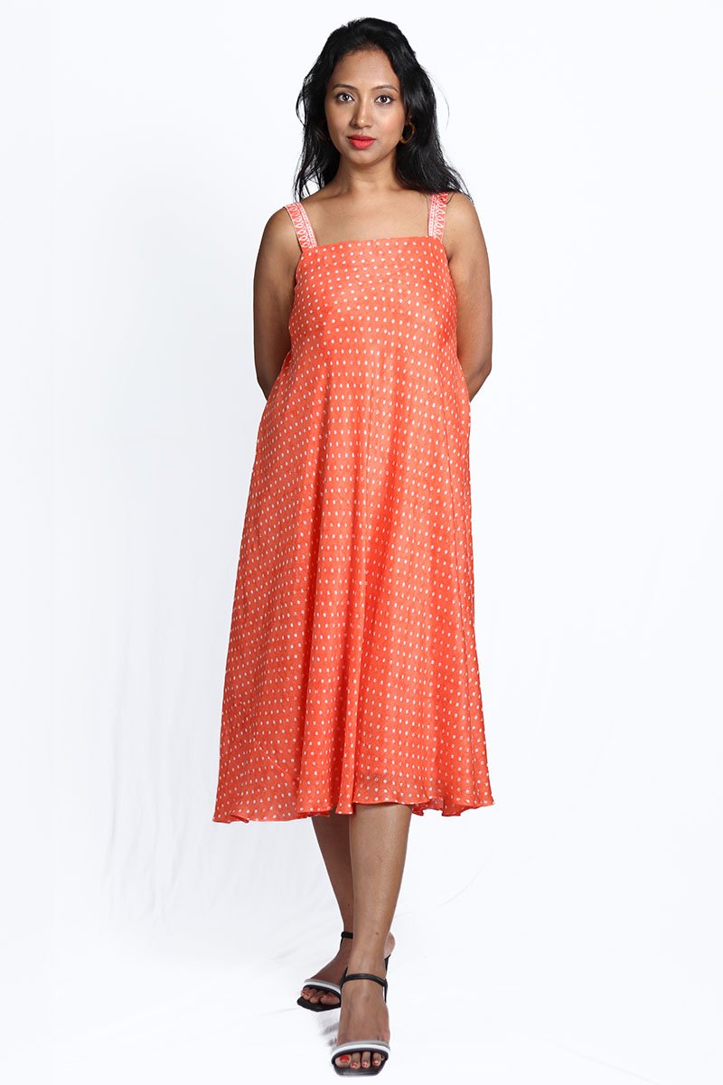 Add a splash of sunshine to your wardrobe with this breezy orange polka dot dress. Crafted from lightweight viscose flowy fabric, this sleeveless midi dress features a flattering square neckline and a softly flared silhouette that moves with ease.