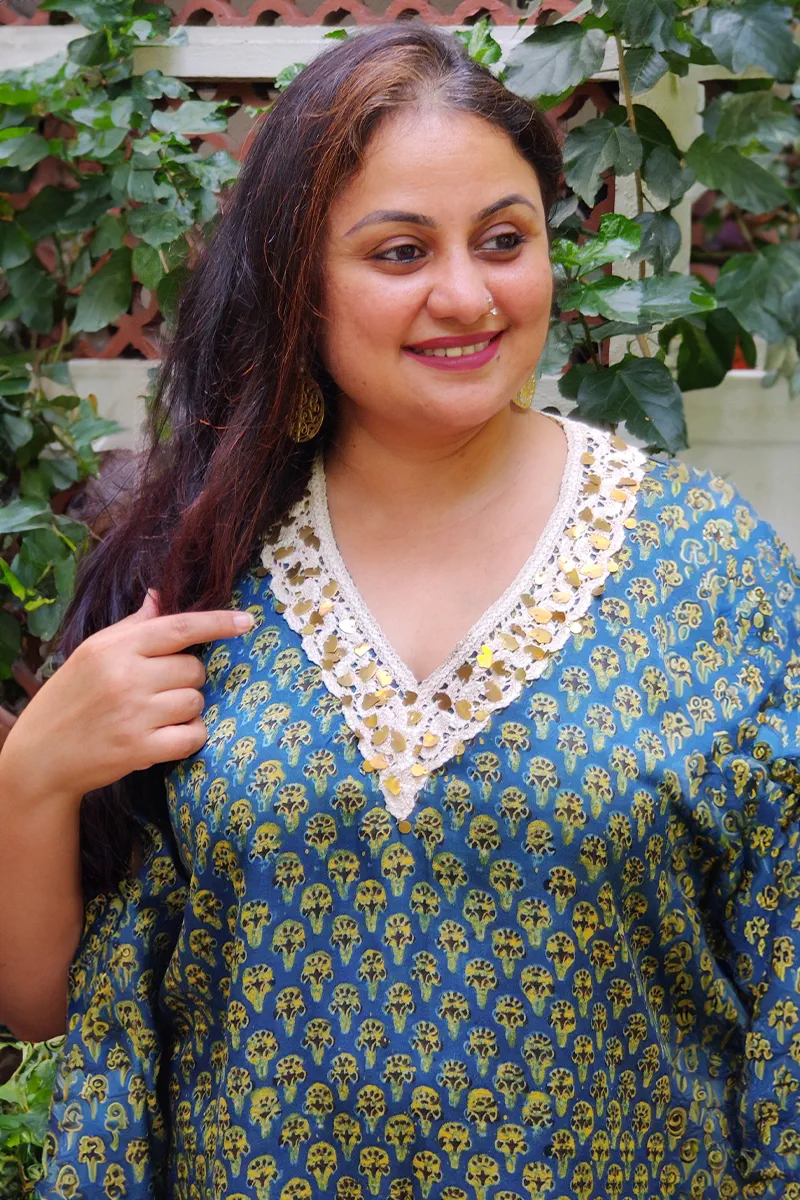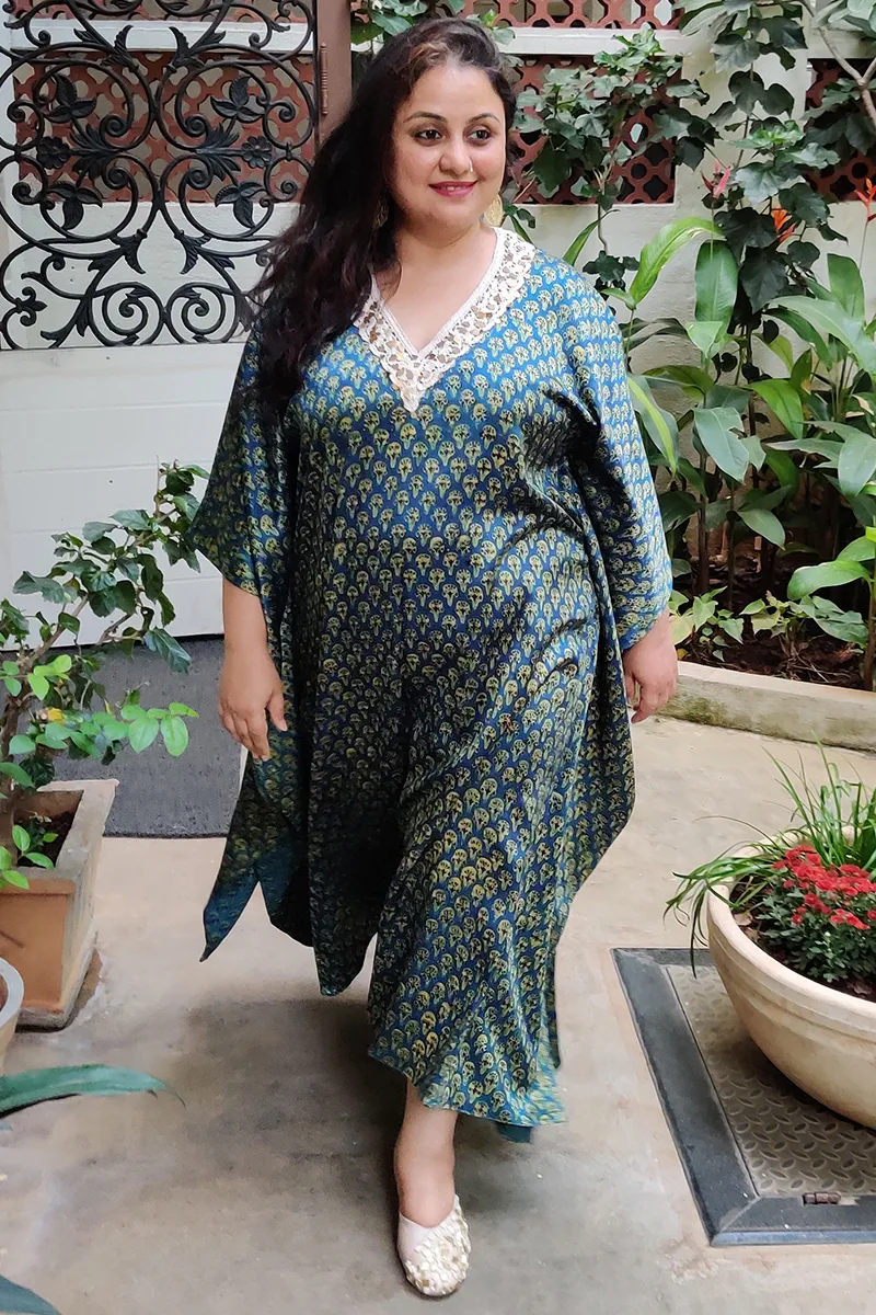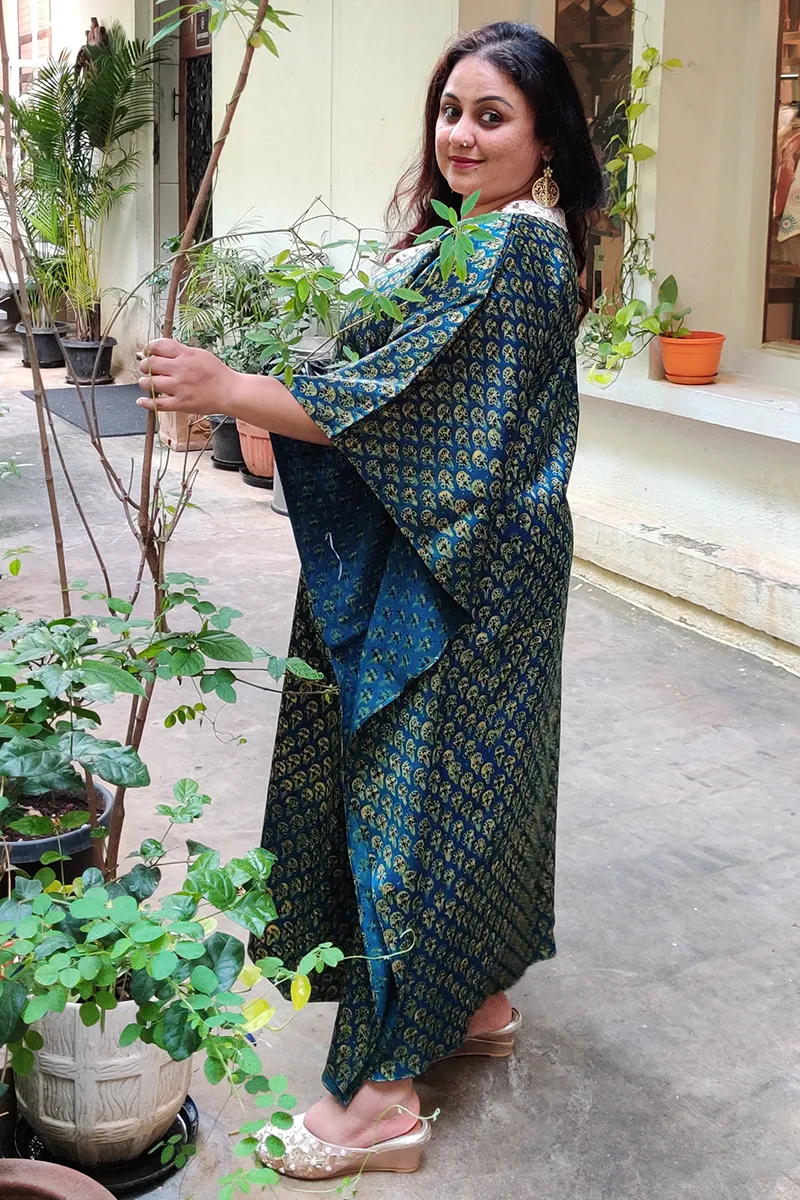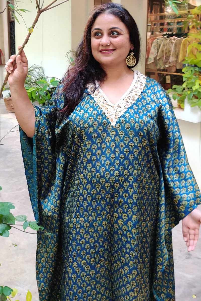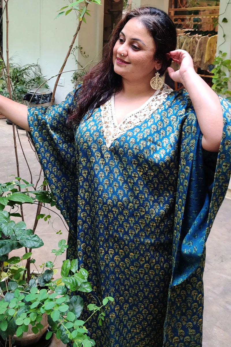 This kaftan features a rich teal blue base adorned with a repetitive block-print inspired motif in soft gold, creating a refined yet lively look. The V-neckline is accentuated with delicate cream lace embroidery, enhanced by metal sequin that add a handcrafted charm. With its wide, flowing sleeves and relaxed silhouette, it offers both comfort and elegance.