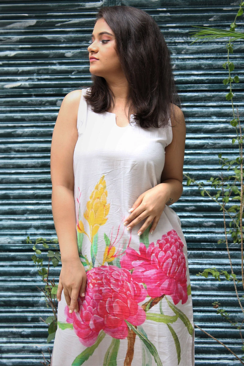 Crafted from soft, breathable cotton, this sleeveless white dress features a stunning floral print. The relaxed silhouette skims the body gracefully, while the subtle round neckline adds a touch of elegance.